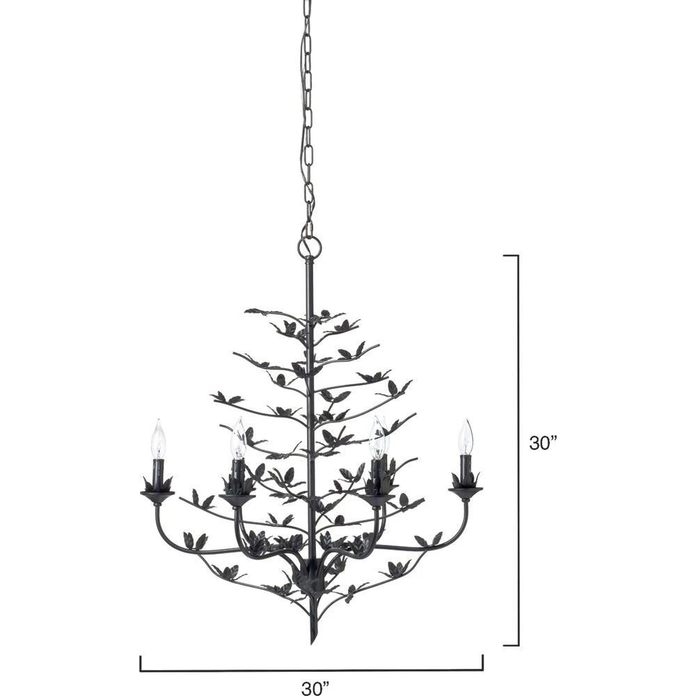 The structure of this chandelier was inspired by the natural beauty of foliage in bloom. Every branch of the black iron chandelier has its own blooming petals, each crafted and attached by hand. Six iron arms hold faux dripping candlesticks blooming out of delicate iron petals. This eye-catching piece of art is expertly handcrafted and will add dramatic flair to your home’s decor. The fixture is suspended from a coordinating 8-foot chain in black iron, and professional installation is recommended.