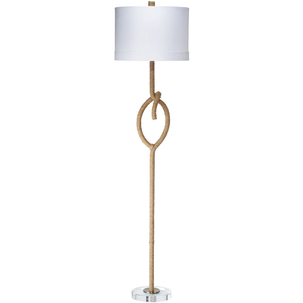 This nautically inspired floor lamp begins as a simple structure with a clear acrylic base but is given bold texture with the addition of natural rope wrapped around its entire body. The single knot detail brings unexpected personality, and the lamp is topped with a banded white linen shade. The matching rope finial is the cherry on top of this uniquely sculptural floor lamp.