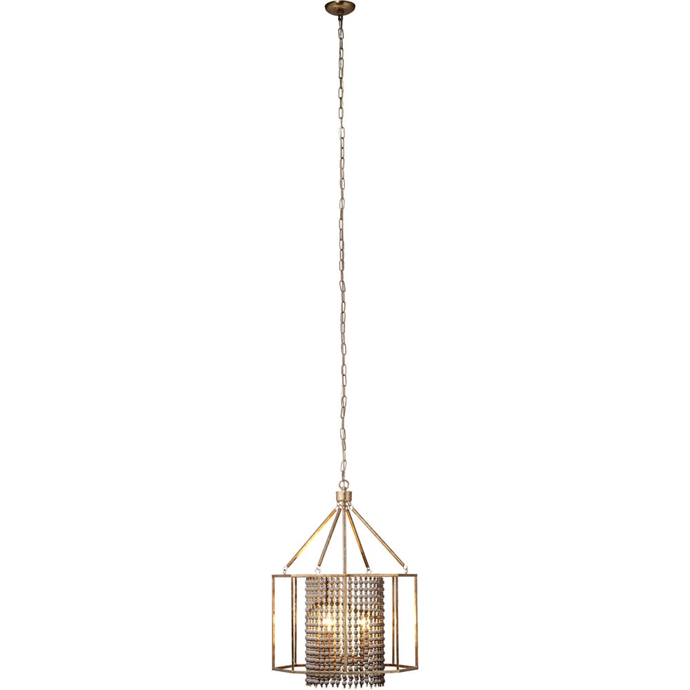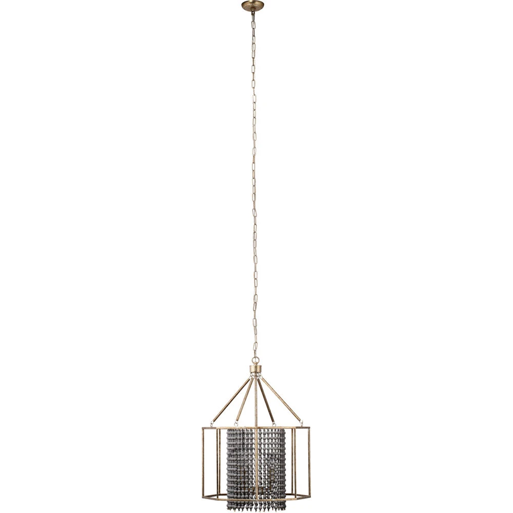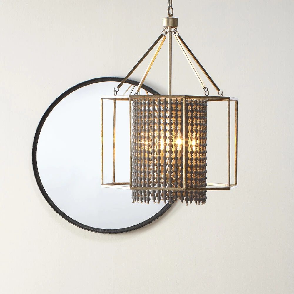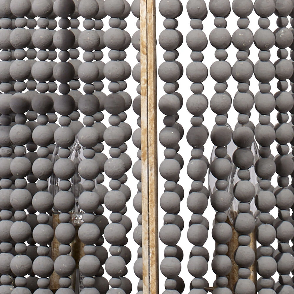 Cascading strands of carved wood beads flow gracefully and abundantly to create the “shade” in this astonishingly lovely chandelier. The antique grey beads are themselves encased in an angular antiqued silver frame whose strong lines provide an expert contrast to the softness of the interior beading. As the beads are carved from natural wood, the finish and striations on each will vary slightly. A unique blend of vintage and modern, this intriguing piece was designed to be easily integrated into a multitude of décor styles. The fixture is suspended from a coordinating eight-foot chain in antique silver metal, and professional installation is recommended.
