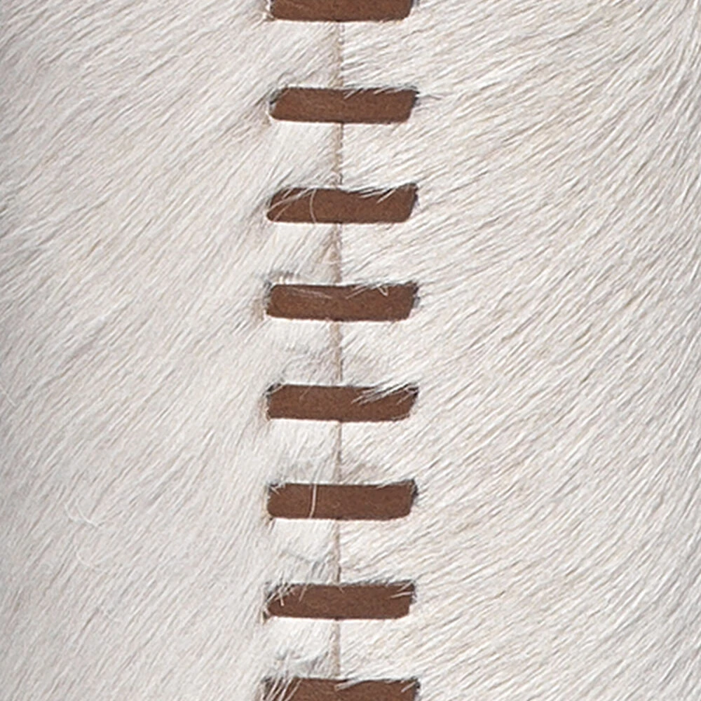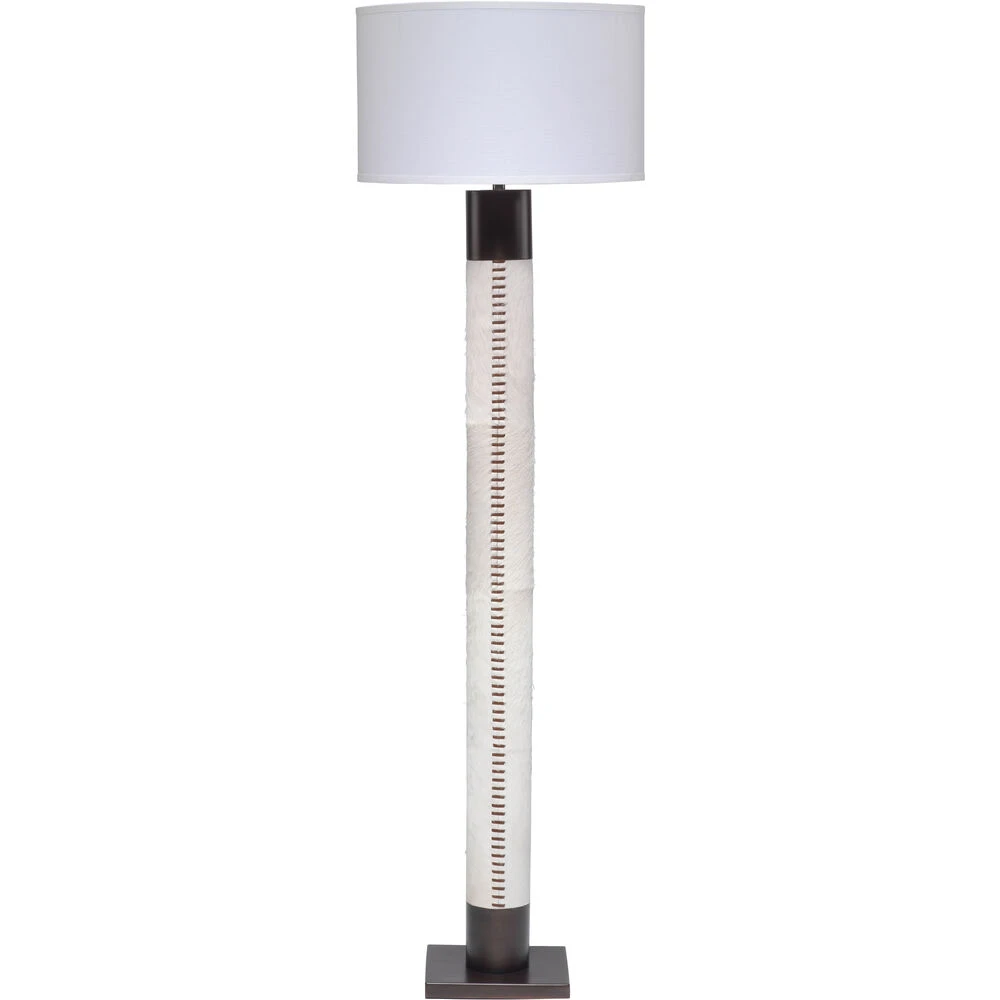 Warm oil rubbed bronze is wrapped in white hair-on hide in this exceptional lighting option. The hides for each are selected by hand; no two hides will be identical. Their masculine edge is enhanced with a bronze finial and softened with an off-white linen drum shade, resulting in a unique choice for study, living area, or den.